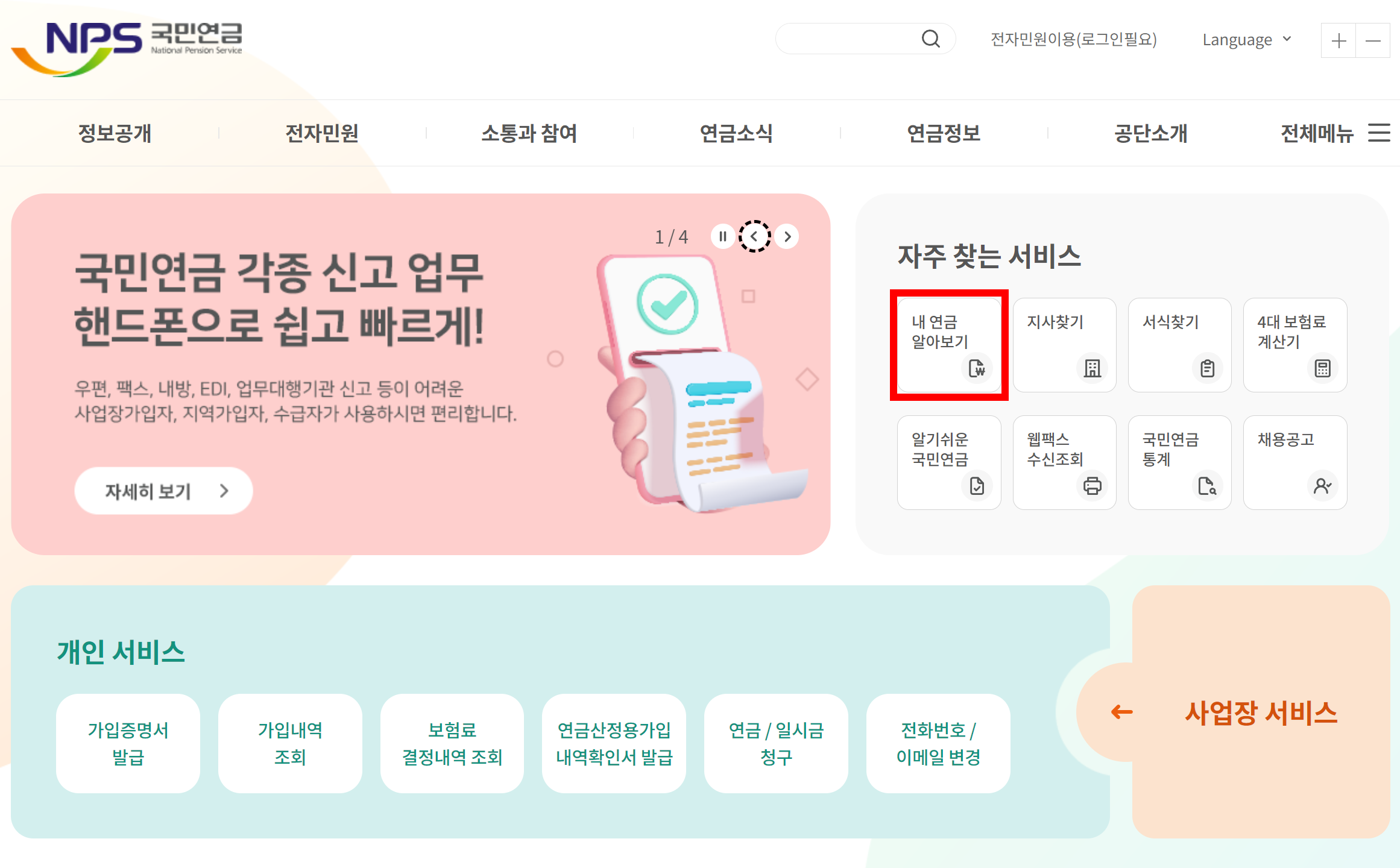 국민연금공단 홈페이지에서 '내 연금 알아보기’를 클릭하고 '가입·납부내역 조회’를 클릭하면 가능합니다. 로그인은 공동·금융인증서나 간편인증으로 할 수 있습니다.